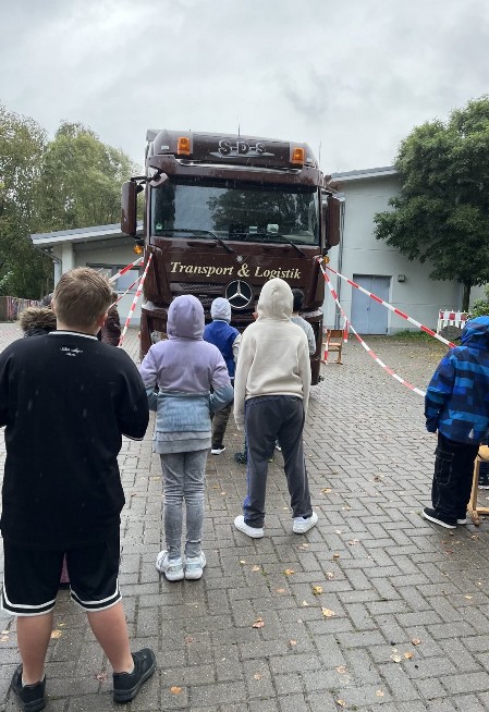 Der tote Winkel des LKWs stellt eine große Gefahr im Straßenverkehr dar. Am 26.09.2024 wurde unseren dritten und vierten Klassen dank der S-D-S Spedition aus Gütersloh die Möglichkeit geboten, praktische Erfahrungen mit dem LKW zur Verkehrssicherheit zu machen. Ziel war es, das Bewusstsein der Kinder für die Gefahren von LKWs im Straßenverkehr zu schärfen. Mit Hilfe eines großen LKWs wurden auf dem Schulhof Gefahrensituationen im Straßenverkehr für die Schüler nachgestellt. Jeder nahm auf dem Sitz des LKW-Fahrers Platz und lernte dessen Perspektive aus dem Führerhaus kennen. Schnell wurde den Kindern bewusst, dass man als LKW-Fahrer sogar eine ganze Schulklasse „übersehen“ kann, wenn diese sich im toten Winkel befindet.